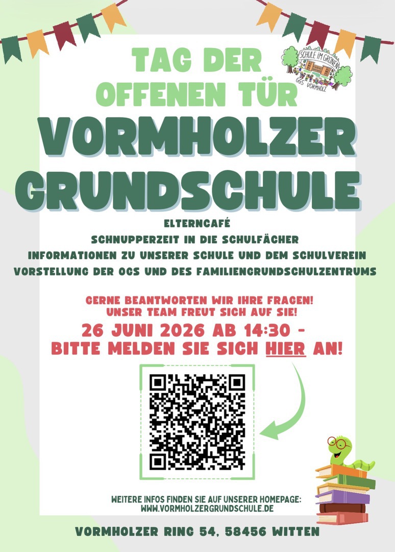 Unser Tag der offenen Tür für Kinder, die 2027 eingeschult werden, findet am Freitag, den 26.06.2026, nachmittags statt ! Bitte buchen Sie einen Termin über den QR-Code. Wir freuen uns auf Sie!